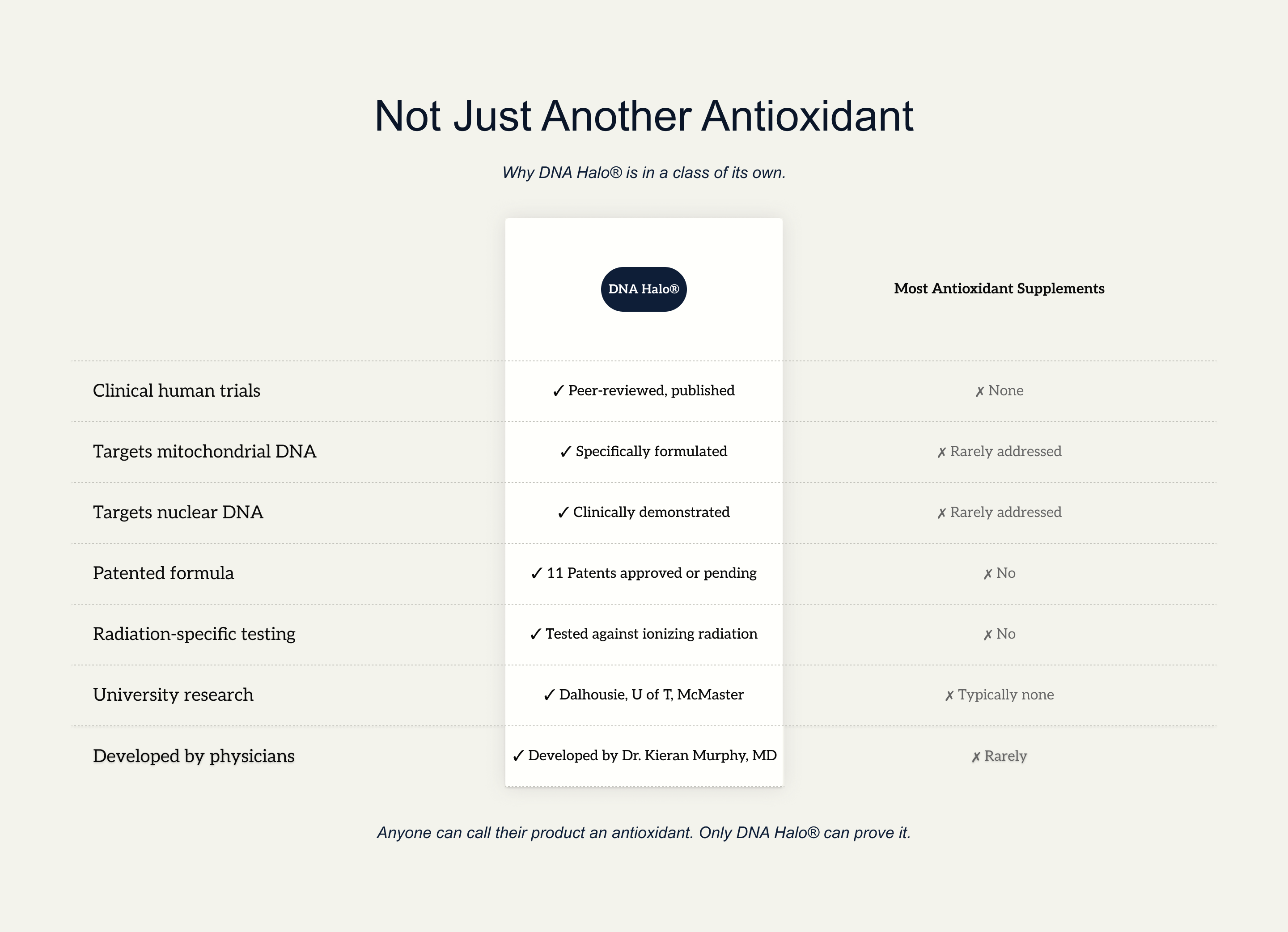 DNA Halo® is not a general antioxidant supplement. It is a precisely formulated, patented complex of ten bioactive ingredients, developed by physician-scientists at the University of Toronto, Dalhousie University, and McMaster University, and proven in peer-reviewed human clinical trials to reduce DNA strand breaks — measured using γH2AX and p53, the gold-standard molecular biomarkers used by cancer researchers worldwide. Anyone can call their product an effective antioxidant. Only DNA Halo® proves it with scientific results.